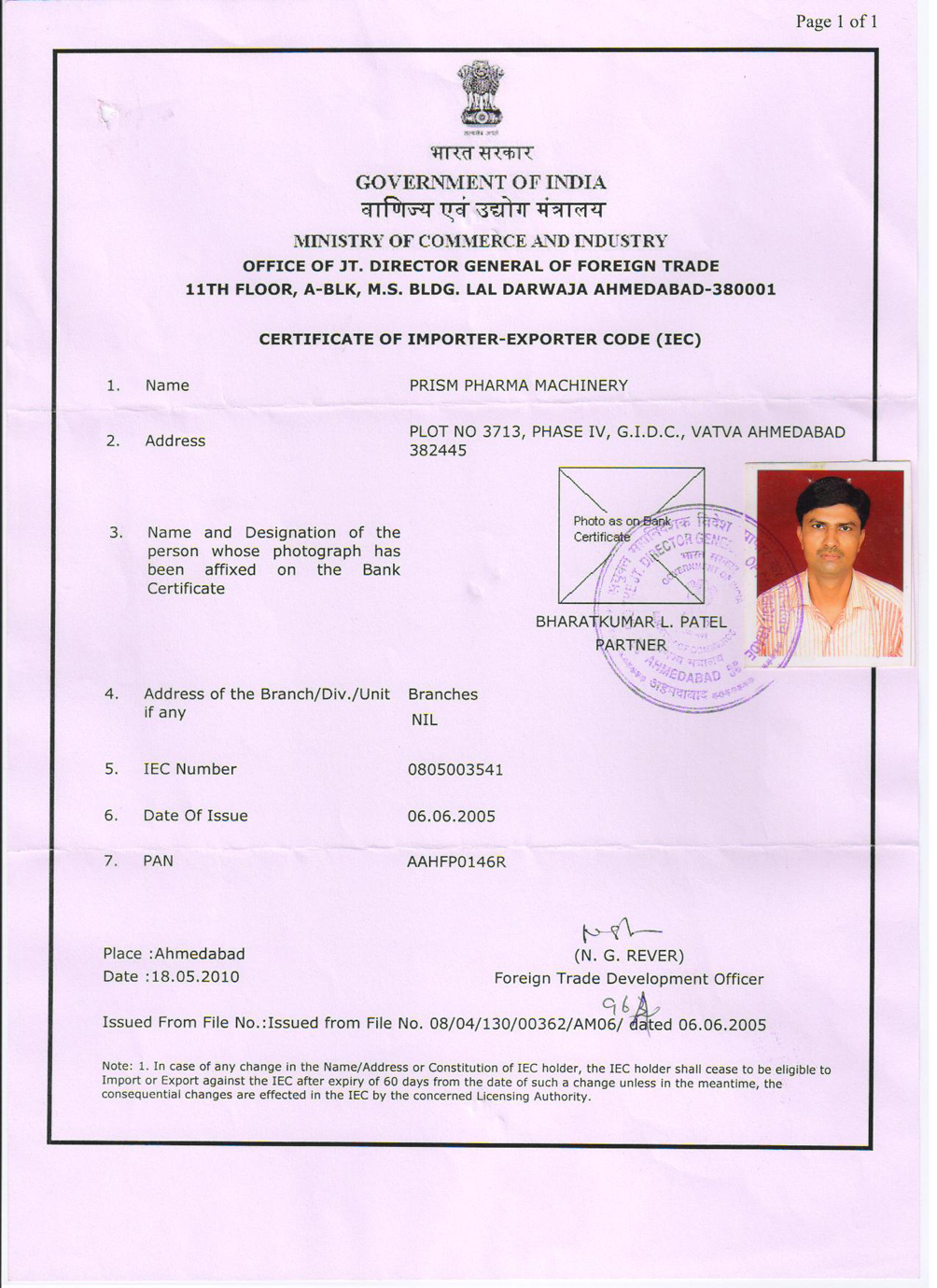Importer Exporter certificate issued by Directorate General of Foreign Trade, Ministry of Commerce & Industry IEC Code 0805003541 DT 06.06.2005